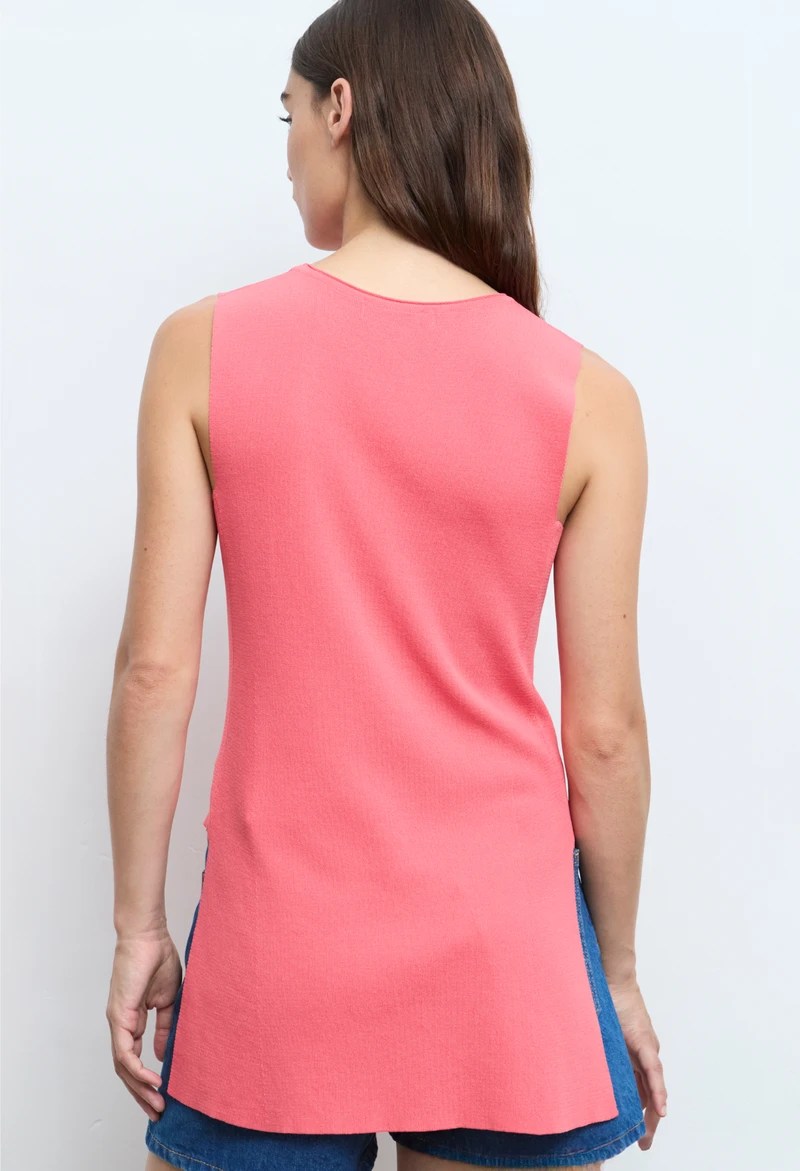 Es un modelo de silueta larga y fluida, sin mangas, que destaca por la calidad excepcional de su punto, ofreciendo una caída impecable y un tacto muy suave. Su diseño minimalista con cuello redondo se ve enriquecido por unas favorecedoras aberturas laterales, que no solo aportan comodidad, sino que crean un movimiento moderno y ligero que se adapta perfectamente a tu figura.