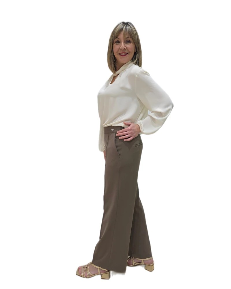Su silueta de pierna ancha con raya marcada al centro crea un efecto visual de longitud infinita, realzado por un tono topo profundo que desprende una elegancia serena y versátil. Confeccionado en un tejido técnico de alta gama que garantiza una caída fluida y sin arrugas, este pantalón se adapta con naturalidad tanto a estilismos de oficina con blusas de seda como a eventos de tarde; su diseño equilibrado y su acabado premium aseguran una presencia impecable, profesional y absolutamente femenina.